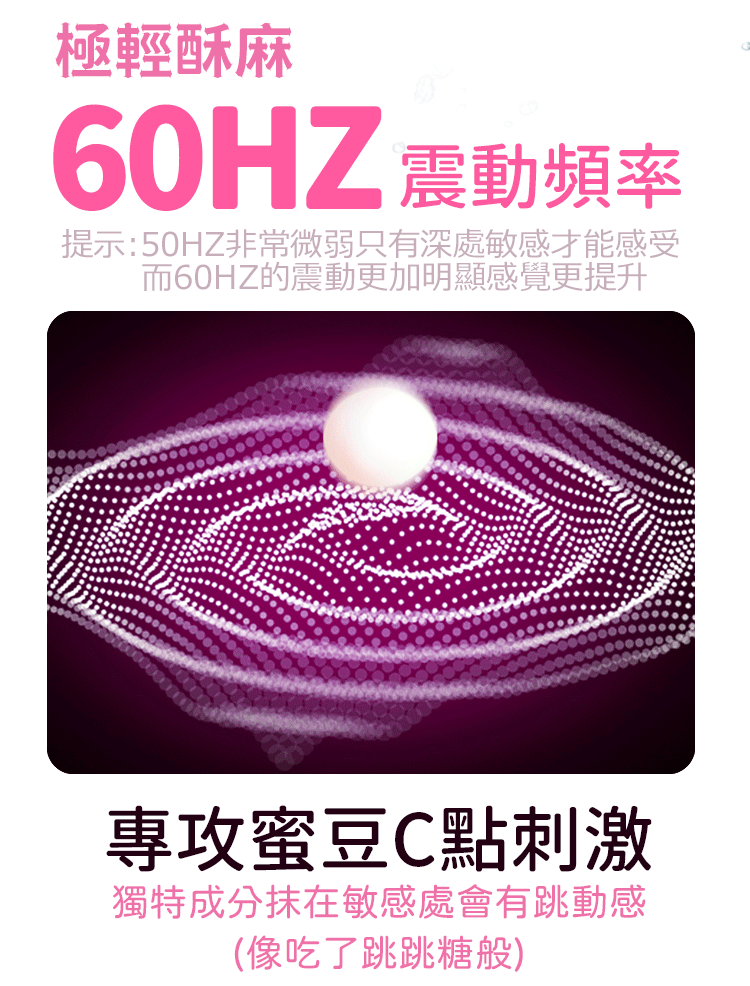 具有獨特震動感,類似跳跳糖帶給您跳動感覺,有助於女性自身分泌潤滑液。