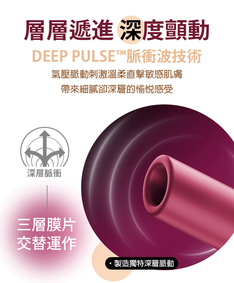 層層遞進的深度顫動,三層膜片交替運作,釋放獨特的磁動脈衝,帶來前所未有的深層快感。